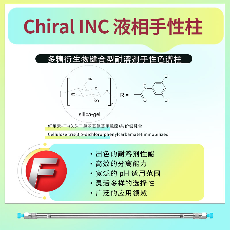 固定相:Chiral INC 鍵合型耐溶劑手性柱的固定相為纖維素-三-(3,5-二氯苯基氨基甲酸酯)共價鍵鍵合(Cellulose tris(3,5-dichlorolphenylcarbamate)immobilized)。這種特殊的固定相設計使得該手性柱具有優(yōu)異的手性識別能力和分離效率。