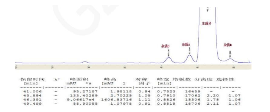 方法說明:該款反相手性色譜柱相比其它的正相方法,采用簡單的反相流動相體系,更為實用方便。峰形對稱,柱效高。藥典要求理論板數(shù)按右布洛芬峰計算不低于 2000,右布洛芬峰與左布洛芬峰之間的分離度應(yīng)大于3.0,此反相方法也完全符合藥典的指標要求。