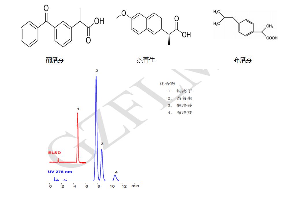 二、布洛芬及其反離子的分析 App ID: FLM-C190066 案例名:酸性藥物萘普生、酮洛芬、布洛芬和堿性反離子鈉的HPLC分離 方法:自定 色譜柱:Comixsil RPAC 3μm 100×3.0mm (貨號:FMD-RPAC3-YONU) 檢測:UV 275 nm/ELSD 45°C 流動相:乙腈:50mM 乙酸銨(pH 5):水 =(70:20:10)