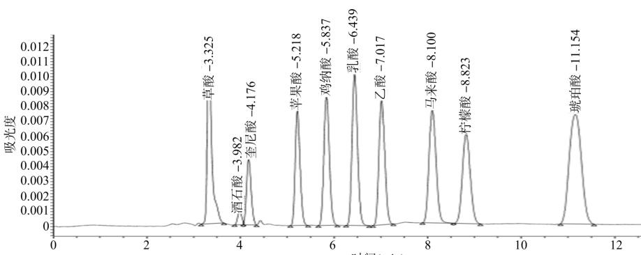 色譜柱:Mars MOA 10μm 300×7.8mm(貨號(hào):FMH-1138-KONU) 流動(dòng)相:2.5mM H2SO4 流速:0.6ml/min 進(jìn)樣體積:10μL 檢測(cè): RID 柱溫:80℃
