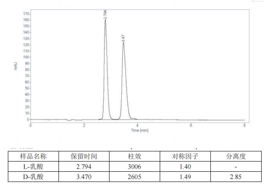 三,乳酸的手性分析方法(HPLC+UV) 流動(dòng)相:2mM CuSO4水溶液:異丙醇=95:5 流速:1mL/min 波長(zhǎng):254 溫度:25C° 進(jìn)樣量:1uL 色譜柱1:Chiral AAOA 3u 50*4.6mm(貨號(hào):FMB-AAOA3-EONU)快速分析