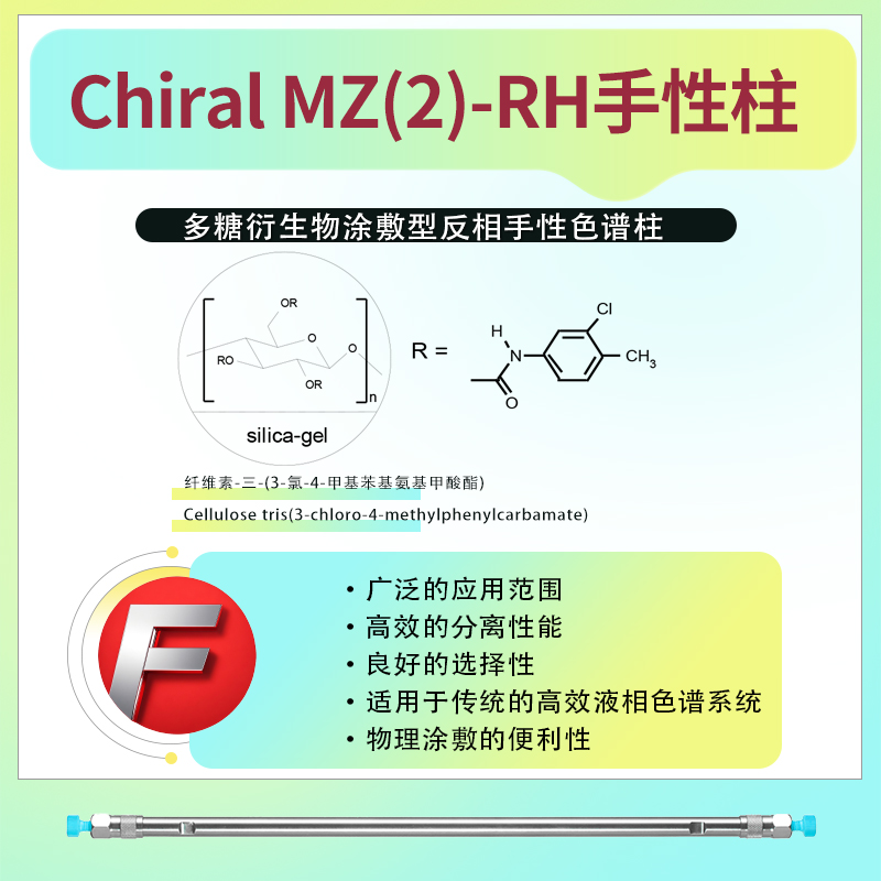 Chiral MZ(2)-RH反相手性柱特別適合于分析水溶性樣品或對pH值有特定要求的樣品。其固定相為纖維素-三-(3-氯-4-甲基苯基氨基甲酸酯),這種固定相具有獨特的手性識別能力,使得該色譜柱能夠有效地分離手性化合物中的對映異構體。